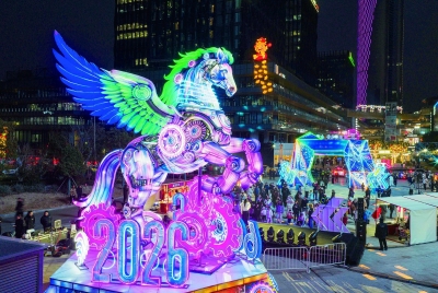 記者在現(xiàn)場看到,上秦淮燈會精心打造了“賽博飛馬”“科技之門”兩大核心主燈組及系列特色燈組。“賽博飛馬”融合6G科技元素與傳統(tǒng)生肖文化,結(jié)合齒輪、芯片與機械羽翼設(shè)計,騰躍的駿馬造型靈動大氣,燈光流轉(zhuǎn)變幻間盡顯科技與傳統(tǒng)之美;“科技之門”以現(xiàn)代科技架構(gòu)為設(shè)計藍(lán)本,融入6G、AI、機器人等元素造型,打造出極具未來感的視覺幻境。