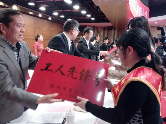 14:12 現在正在進行大會的第二項議程,主席臺全體領導為獲得先進榮譽的集體和個人頒獎。正在頒發的是“南京市工人先鋒號”的10個優秀女職工班組代表。